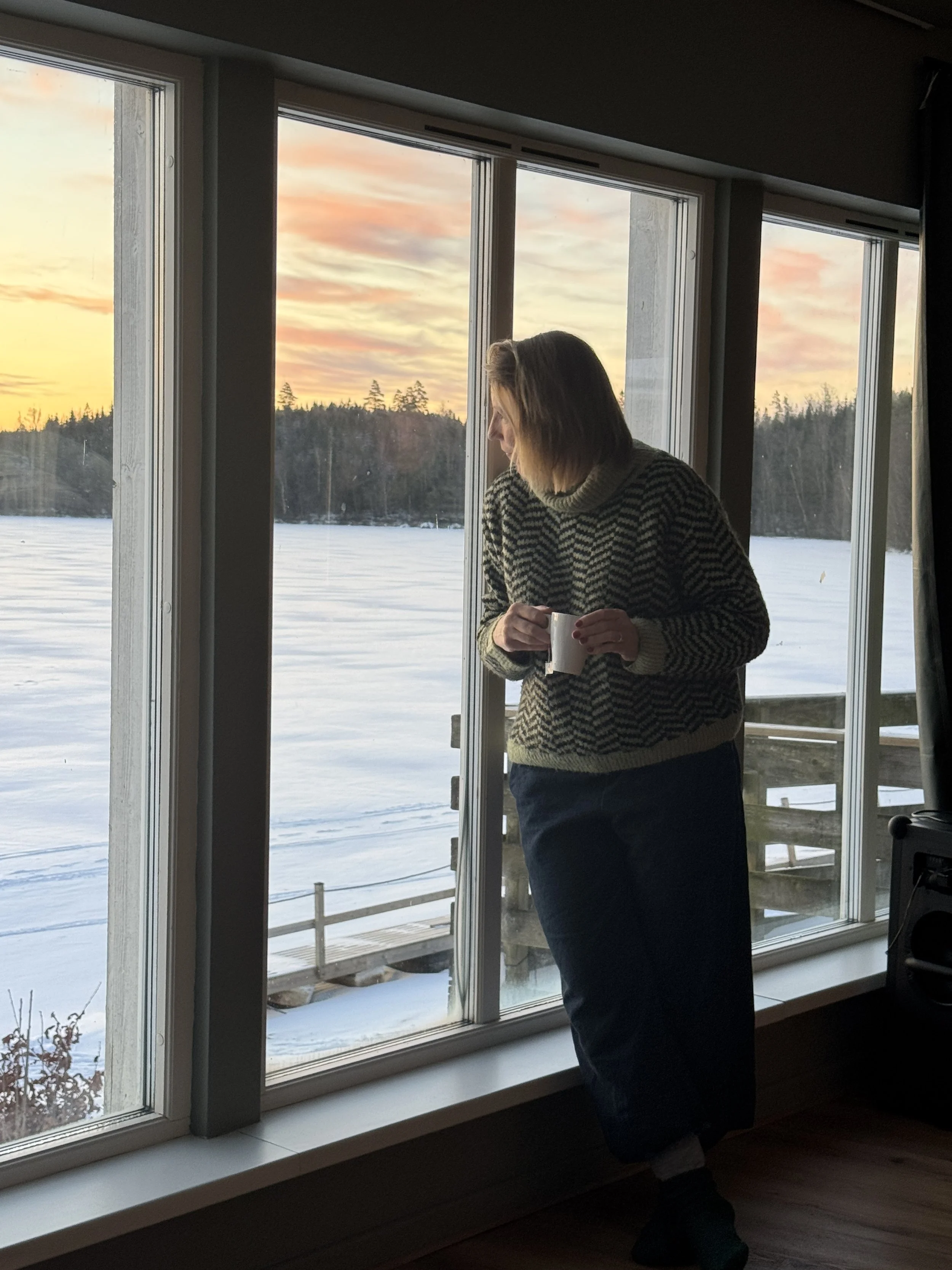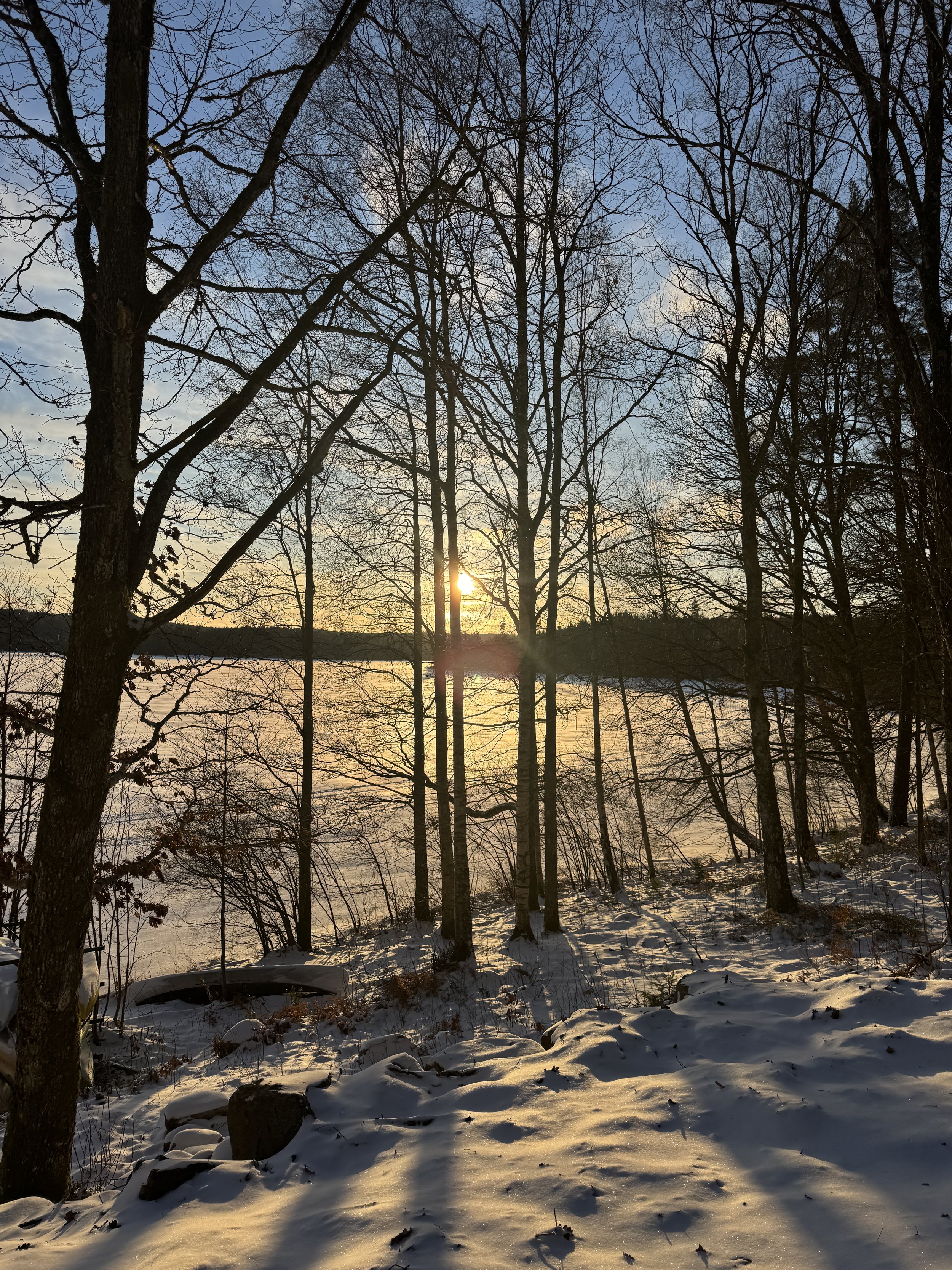 The location was stunning though. We were right on the lake, and when we arrived the ice was so thick you could walk on it. Terrifying at first - I wasn't sure I trusted it - but as the week went on I got braver! Thursday night it snowed, proper Swedish snow that just kept coming. Not blizzardy exactly, just persistent and beautiful. Freezing cold, the kind where you can see every breath, but those crisp days with the sun low in the sky were glorious. The sunrises made getting up early actually worth it.